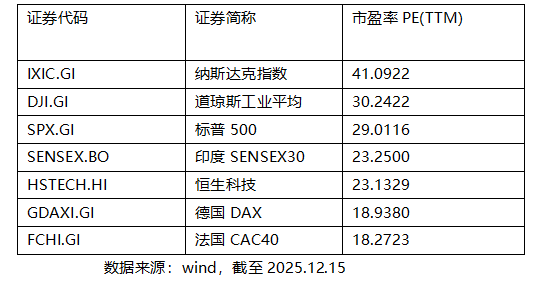 从估值来看,截至2025年12月15日,恒生科技指数市盈率PE(TTM)为23.13倍,处于近十年35%的分位点,而且,相比较其他全球主要指数的估值,恒生科技指数的估值也处于较低位置,配置性价比凸显。