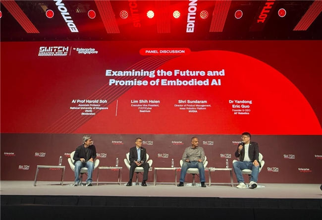 当天下午,郭彦东博士受邀出席SWITCH 2025主论坛“Examining the Future and Promise of Embodied AI”圆桌讨论,成为全场唯一来自中国的企业代表,与新加坡国立大学具身智能教授Harold Soh、淡马锡旗下Seatrium执行副总裁Lim Shih Hsien、NVIDIA 高管等嘉宾同台对话。