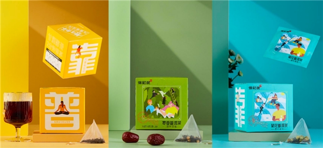 在面向年轻消费群体的新茶饮产品上,柏星龙则运用青年文化元素,让包装更生动有趣。比如,将茶叶口味化作简笔画形象,以印章形式点缀,结合茶叶属性与场景插画,用明亮色调进行品类区分,并采用侧拉悬窗盒型设计,增强日常使用的互动感和趣味性,让消费者在开盒的瞬间体验“趣味+便利”的茶饮体验。