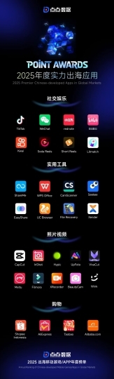 据悉,该榜单由点点数据发布,以 2025 全年累计下载量为核心基准,综合收入、月活用户及应用商店评分等多维度指标,展现了中国出海应用在全球市场的核心竞争力与创新方向。