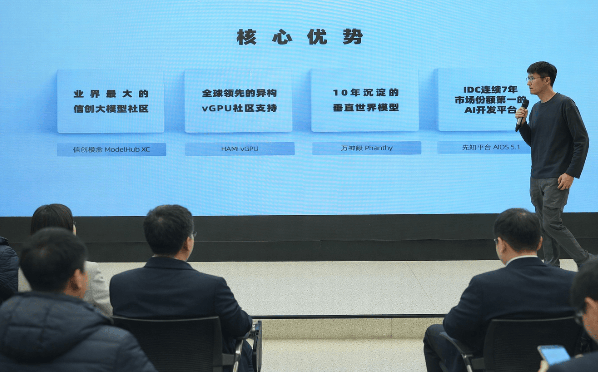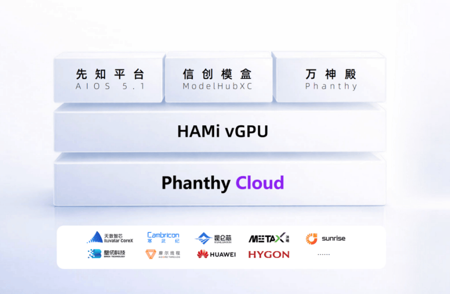 云层:无缝兼容公有云、私有云及混合部署模式,在保障弹性伸缩的同时,满足政企客户对安全、合规的刚性要求。算力层:集成高性能异构vGPU调度引擎,并获得全球活跃的算力管理社区HAMi支持,实现对GPU资源的精细化切分、隔离与统一调度。该设计显著提升在多团队、多任务、负载波动场景下的资源利用率与交付效率,让高昂的算力投入变得更具成本可控性。能力层:全面融入范式十年来自研积累的AI核心能力,具体包括三大支柱:1.模型生态:破解信创落地“最后一公里”
