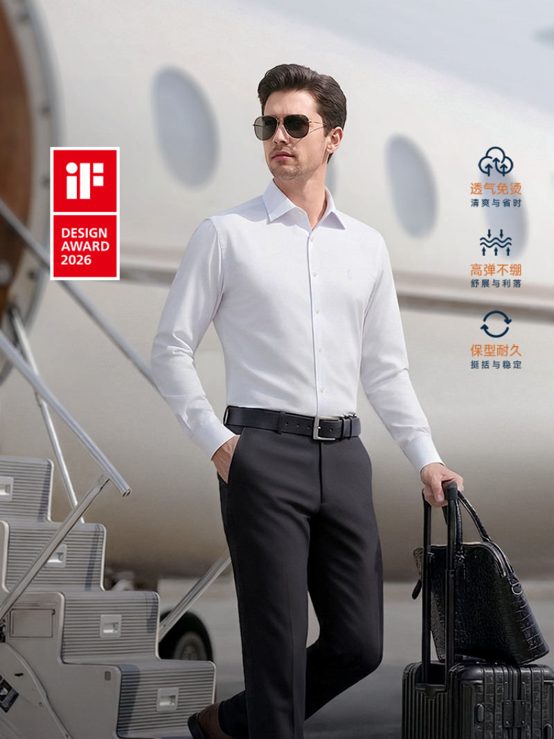 同时产品以120支Pima棉搭配科技高弹纤维打造“超韧骨架”,进一步提升面料弹性与韧性,让商务男士在多场景中都能舒展无拘、清爽有型。此外,产品还具有“久穿领不塌”和“抗皱免熨烫”等优点,让商务男士在繁忙的差旅行程中,无需打理衣物,始终保持挺括有型。