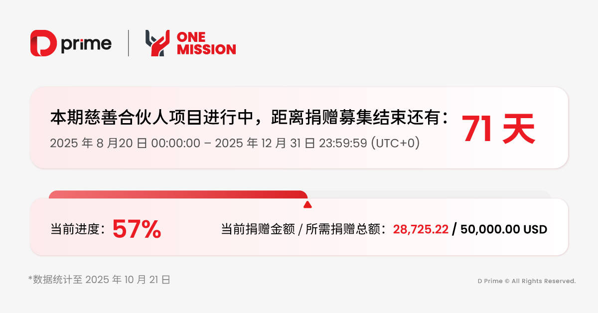 自 2025 年 8 月 20 日"慈善合伙人计划"启动至今,D Prime 携手广大客户用善意共同书写的公益答卷,在这个金秋时节迎来了温暖的半程里程碑:云县特殊教育学校运动场建设公益项目捐赠募集进度已超过 50%,当前捐赠金额已达 28,725.22 USD。(数据截止时间2025/10/21)