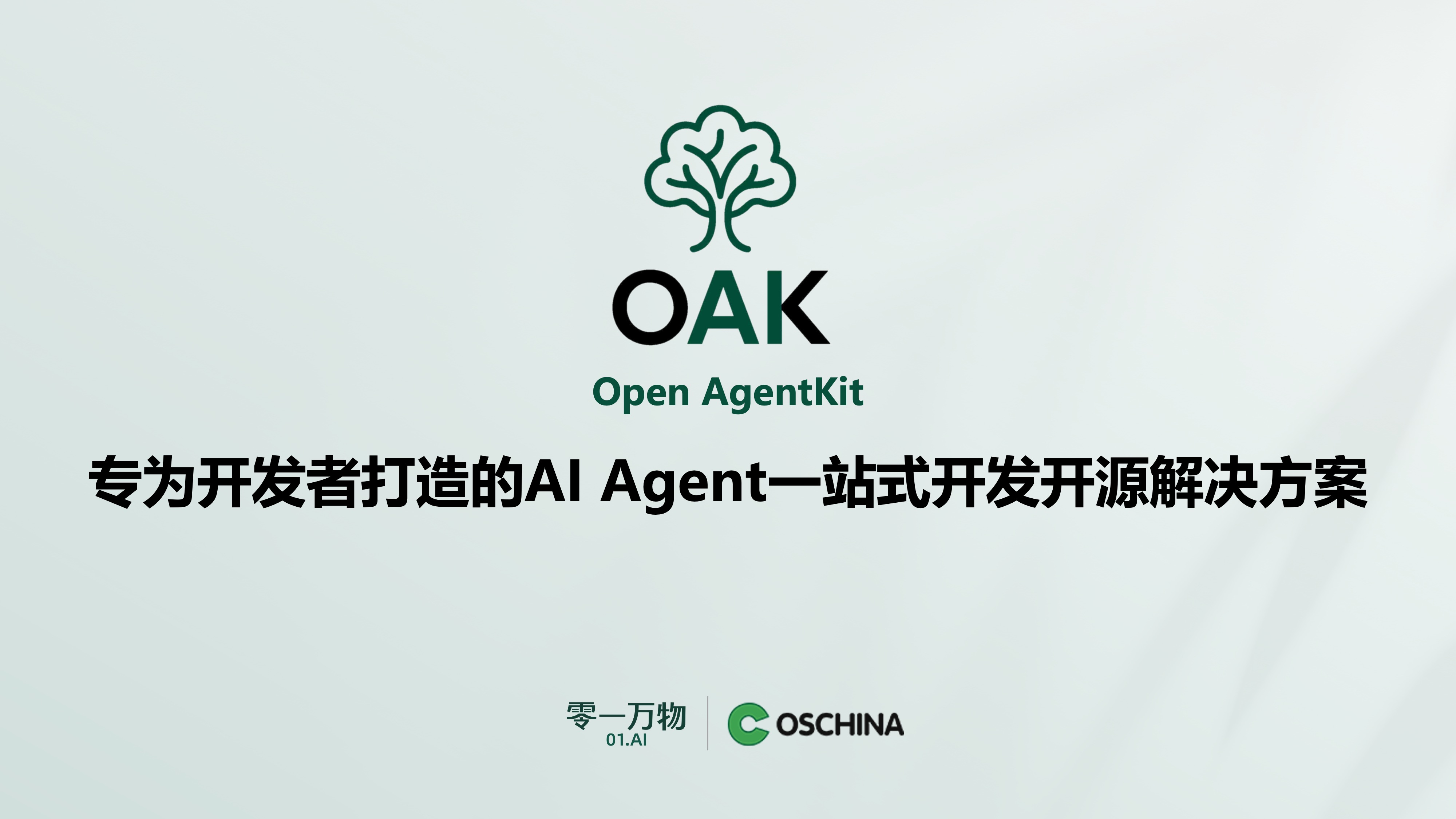正是基于这样的初衷,零一万物和开源中国正式发起OAK(Open AgentKit)开源项目,旨在与全球开发者共同打造一款开放、通用的AI Agent开发平台。