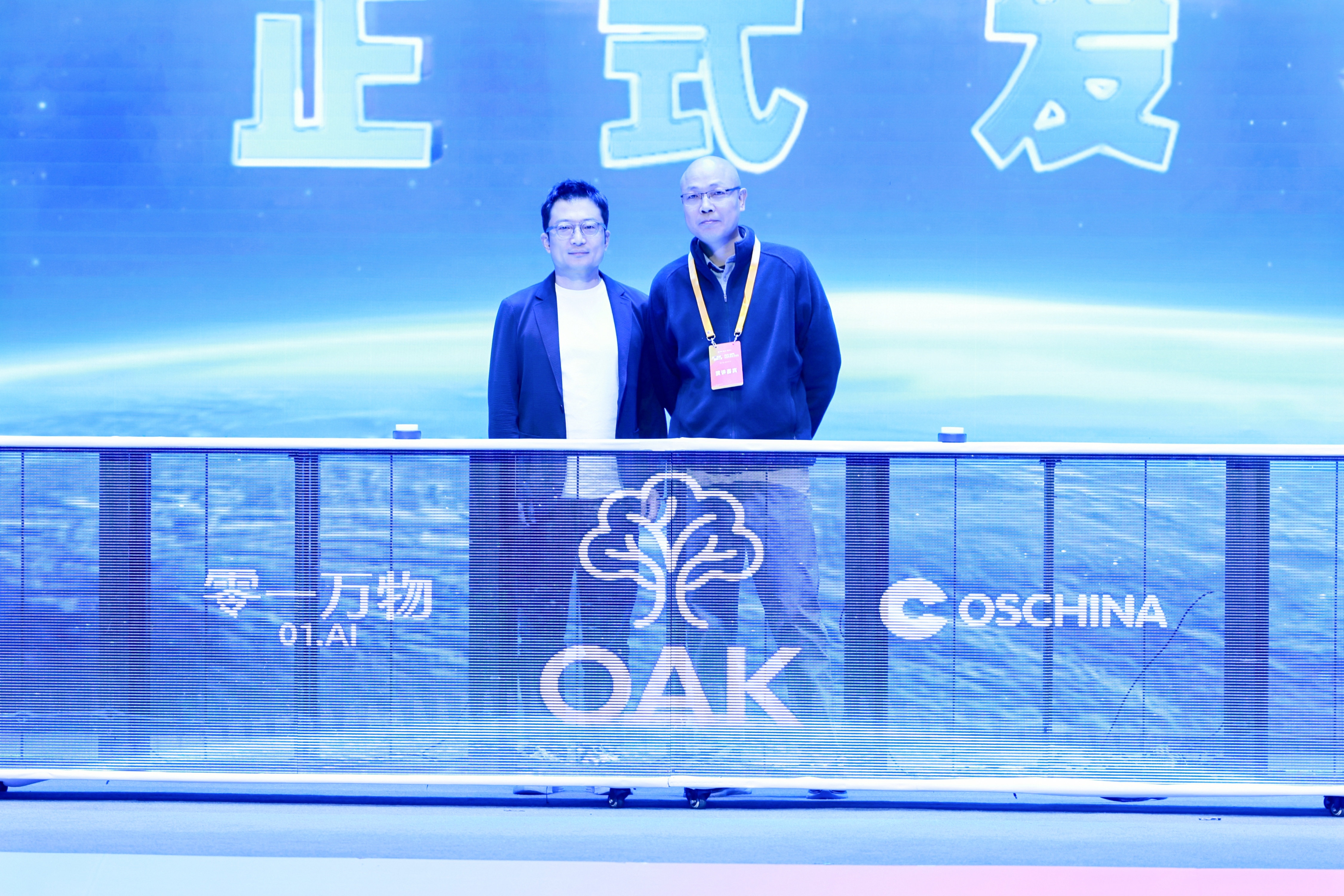 零一万物联合创始人 马杰(左)、开源中国创始人、CTO 刘冬(右)联合发布OAK平台