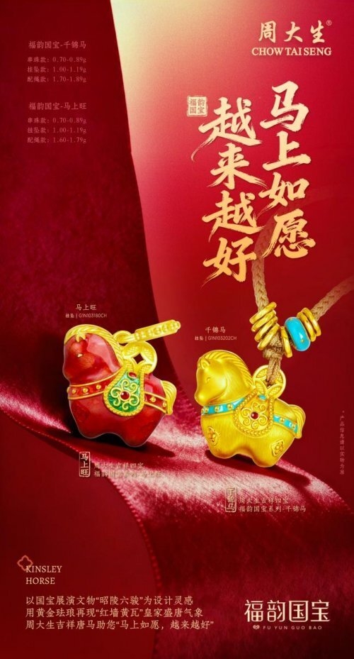 周大生推出的马年生肖作品,紧紧围绕“马上吉祥,越来越好”的核心祝福展开。“马上”一词,既呼应生肖主题,亦蕴含“即刻、迅速”的双关美意,传递出积极行动、如愿以偿的美好寓意。本次马年系列新品承载着这份穿越千年的祝福,演绎着唐马文化的之美。