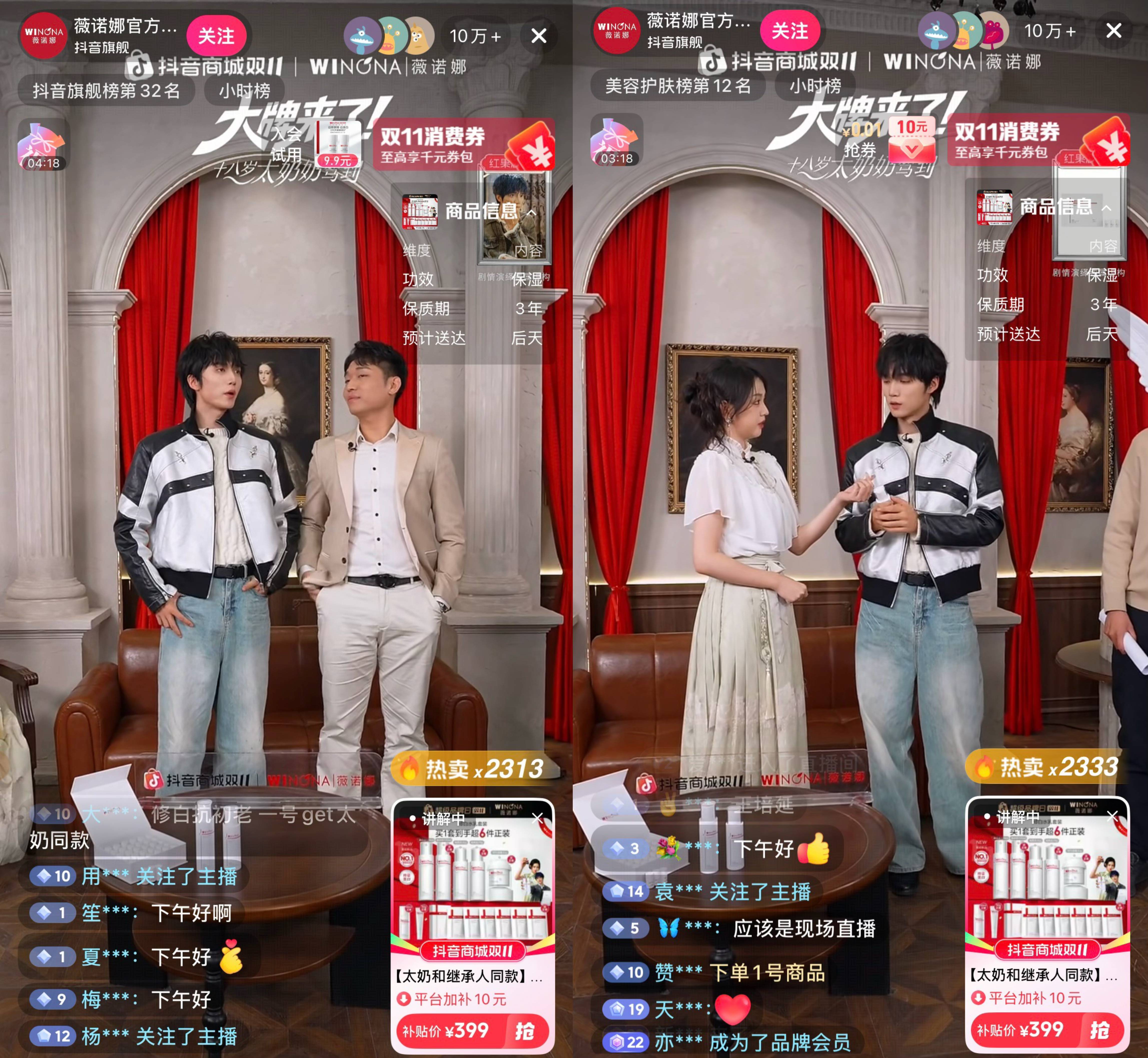 抖音商城找准了营销节点。就在剧粉们看完大结局意犹未尽、正愁没得嗑的时候,直播间秒变“续集小剧场”准时上线。这一波操作,稳稳接住了《太奶奶3》带来的泼天流量,让品牌不是硬插广告,而是成为故事延续的自然角色。平台x品牌xIP三方联手,牢牢占住了观众的注意力高点。