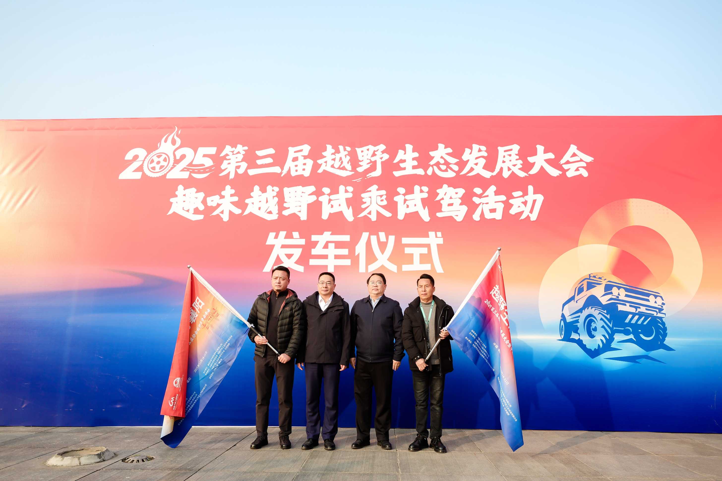 致辞过后,张驰、孙三宝共同向襄阳市汽车运动协会会长饶彩河、刀峰中国越野车会创始人张飞(一刀)先生授旗并宣布发车。