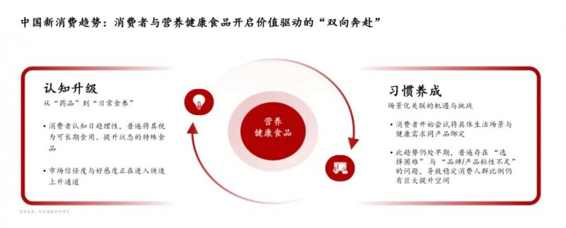 中国市场的新消费趋势:消费者与营养健康食品开启价值驱动的“双向奔赴”,营养健康食品在消费者端发生了从“药品”到“日常食养”的认知升级,场景绑定也催生了品类消费习惯的养成。叠加中国市场政策、消费升级、人群扩大、渠道、科技等多维利好,结构性升级驱动行业变革,新消费时代下,营养健康食品正开启新篇章。