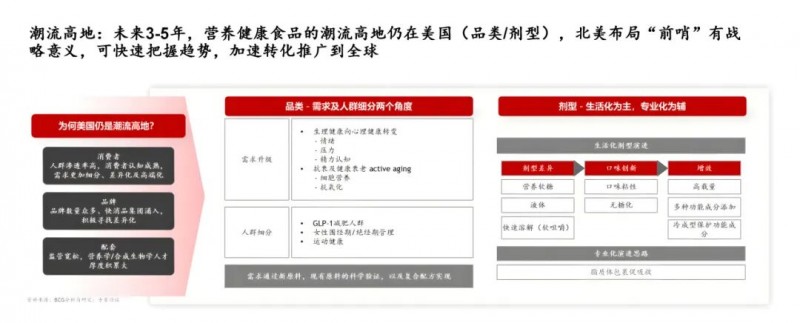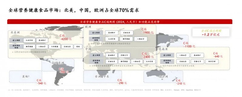 全球营养健康市场正呈现显著的区域“温差”。目前,全球营养健康食品市场规模已达约1.2万亿元人民币,北美、中国和欧洲占据了全球70%的需求1。在渗透率高达55%的北美成熟市场,消费者需求从“全能”转向“精准”补充,心脑血管、骨骼健康及健康老龄化领域呈现出功能精细化与剂型生活化的双轴并行1。而在东南亚、南美等新兴市场,年轻人口结构催生了美丽健康与运动营养的爆发红利。