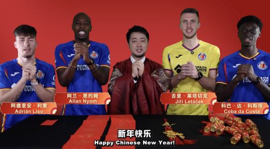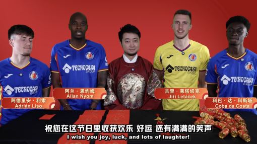 在本次马年新春祝福视频中,赫塔菲俱乐部多位球员集体亮相,共同为节日增添浓浓喜气。拍摄期间,几位球员在视频中跟随主持人了解春节民俗文化,并在主持人指导下认真学习中文祝福语,力求用最诚挚的方式向亚洲球迷传达节日问候,视频中,后卫阿德里安·利索、右后卫阿兰·恩约姆、中场吉里·莱塔切克以及前锋科巴·达·科斯塔一同出镜,身穿赫塔菲经典战袍,在视频前笑意盈盈地用中文说出统一的祝福语:“新年快乐,马年大吉,愿大家前程广阔、平安如意!”