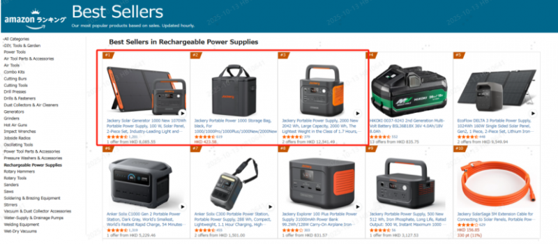 日本市场中,亚马逊日本站户外电源品类市占第一,同样包揽畅销榜前三,在当地市场持续保持遥遥领先。
