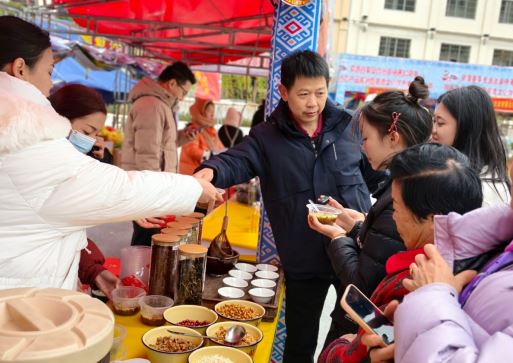 互动区里,打糍粑、打油茶、少数民族高山流水迎宾等项目人气爆棚。石臼里的糯米在木槌捶打下逐渐变得软糯,游客们挽起袖子轮流参与,沉浸式体验传统美食制作的乐趣;打油茶摊位前,苗族老乡手把手教大家炒茶、煮茶,醇厚茶香伴着欢声笑语飘散;身着民族服饰的姑娘们用“高山流水”迎宾的待客礼仪,将清甜米酒经过由高到低排列的竹筒缓缓注入游客杯中,让现场充满浓郁的民族风情与生活气息。美食体验区香气扑鼻,资源黑猪肉丸、五排油茶、高山冷水鱼鱼饼等各类特色美食趁热出锅,大家在味蕾与体验的双重盛宴中,直观感受了资源生态农业的丰硕成果与独特民俗文化。