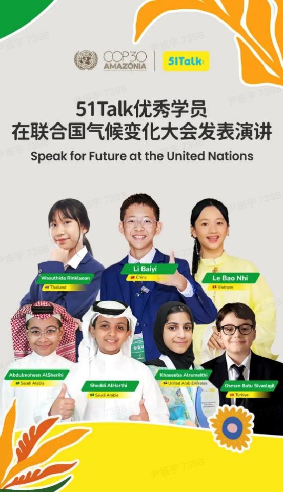 在实践创新层面,51Talk连续多年打造的“中华少年说,走进联合国”等公益项目已形成具有全球影响力的交流平台。该活动通过全球遴选机制,每年从各国选拔优秀青少年代表,登上联合国气候变化大会等国际舞台。今年,来自中国、越南、泰国、阿联酋、沙特阿拉伯和土耳其等国家青少年,在该平台上发表了精彩的全英文演讲。这不仅为各国青少年提供了展示与对话的国际化窗口,更系统性地推动他们实现从“我能说英文”到“自信表达、引领观点”的综合素养跨越。