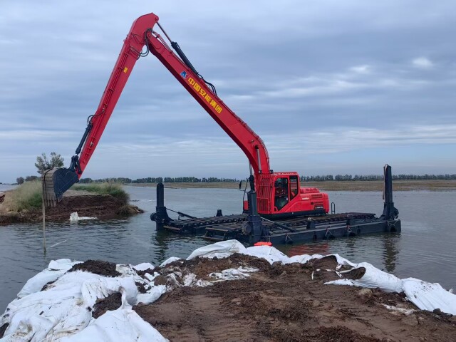 该水陆两栖挖掘机适用于抗洪抢险与水上工程救援场景,具备船舶般的漂浮与自航能力,可直接在水面上作业。该设备浮力超60吨,航速达7公里/小时,并搭载智能化控制系统与远程遥控功能;采用伸缩式浮箱底盘,能快速自主上下运输车辆,显著提升转场效率。可配备铲斗、破碎锤、清淤泵等多种工具头,实现一机多能。