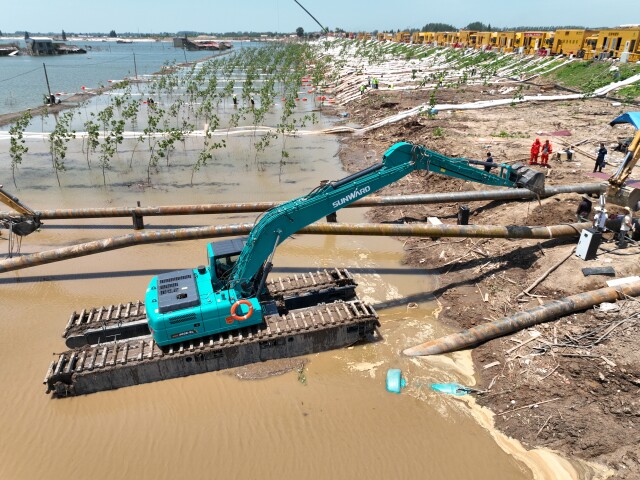 (山河智能研制的新型水陆两栖挖掘机正在作业。图源山河智能。)