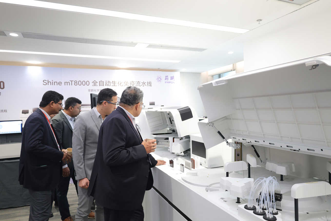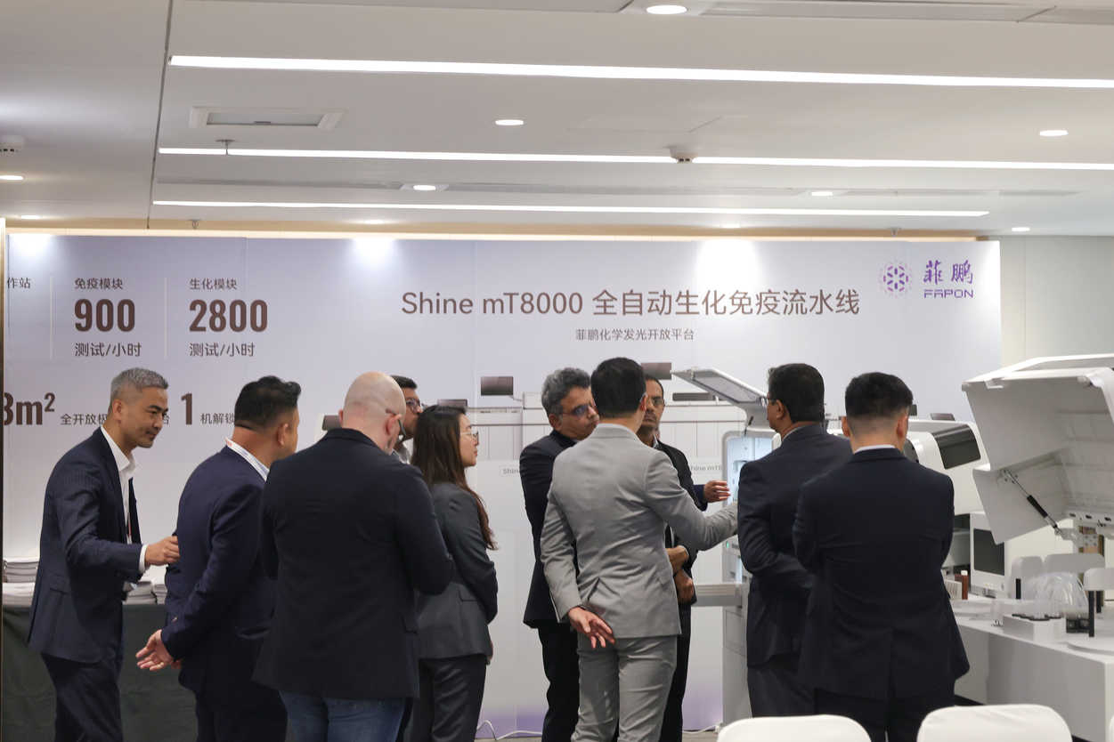 面对国内 IVD 市场增速放缓、集采常态化的行业新格局,菲鹏基于多年全球服务经验,深度剖析了当前 IVD 行业出海机遇及首次公开分享多个出海成功案例,并重磅发布了 Shine mT8000 生化免疫流水线、心肌标志物及小分子检测等领域的创新产品,向到场的国内外客户全面展示了其作为“全球 IVD 整体解决方案供应商”的最新发展成果。