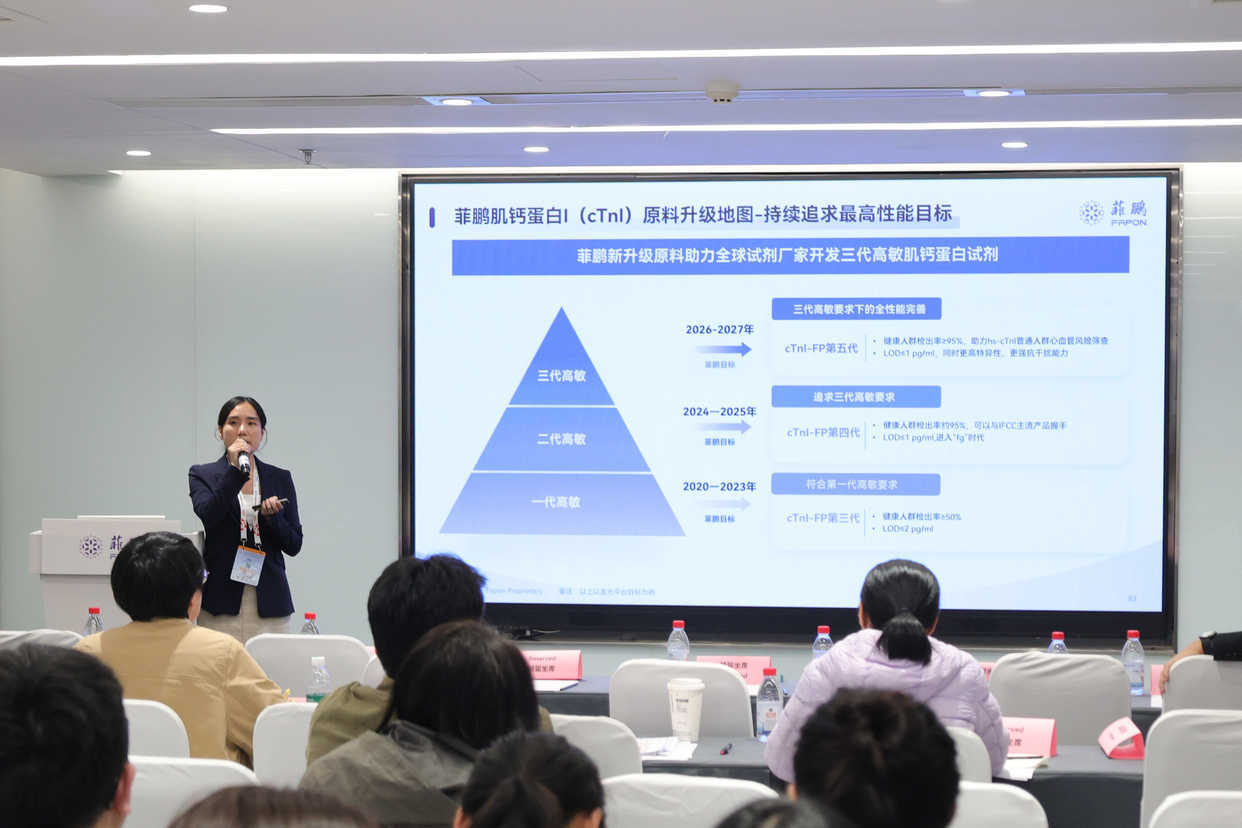 除了重磅仪器新品,菲鹏在核心原料领域也展示了多项创新产品。在心肌标志物方面,菲鹏升级的新原料肌钙蛋白 I?助力全球试剂厂家开发第三代高敏产品,菲鹏借助多年积累的多样化的抗体开发技术平台,持续开发高灵敏度原料,检测限(LoD)迈入 “fg” 级(≤1 pg/ml),同时持续迭代,加强抗体原料抗干扰能力;同时,NT-proBNP?的升级原料 LoD 低至 1.7 pg/ml,与国际主流厂家测值相关性 R2 高达 0.99,助力临床精准诊断。