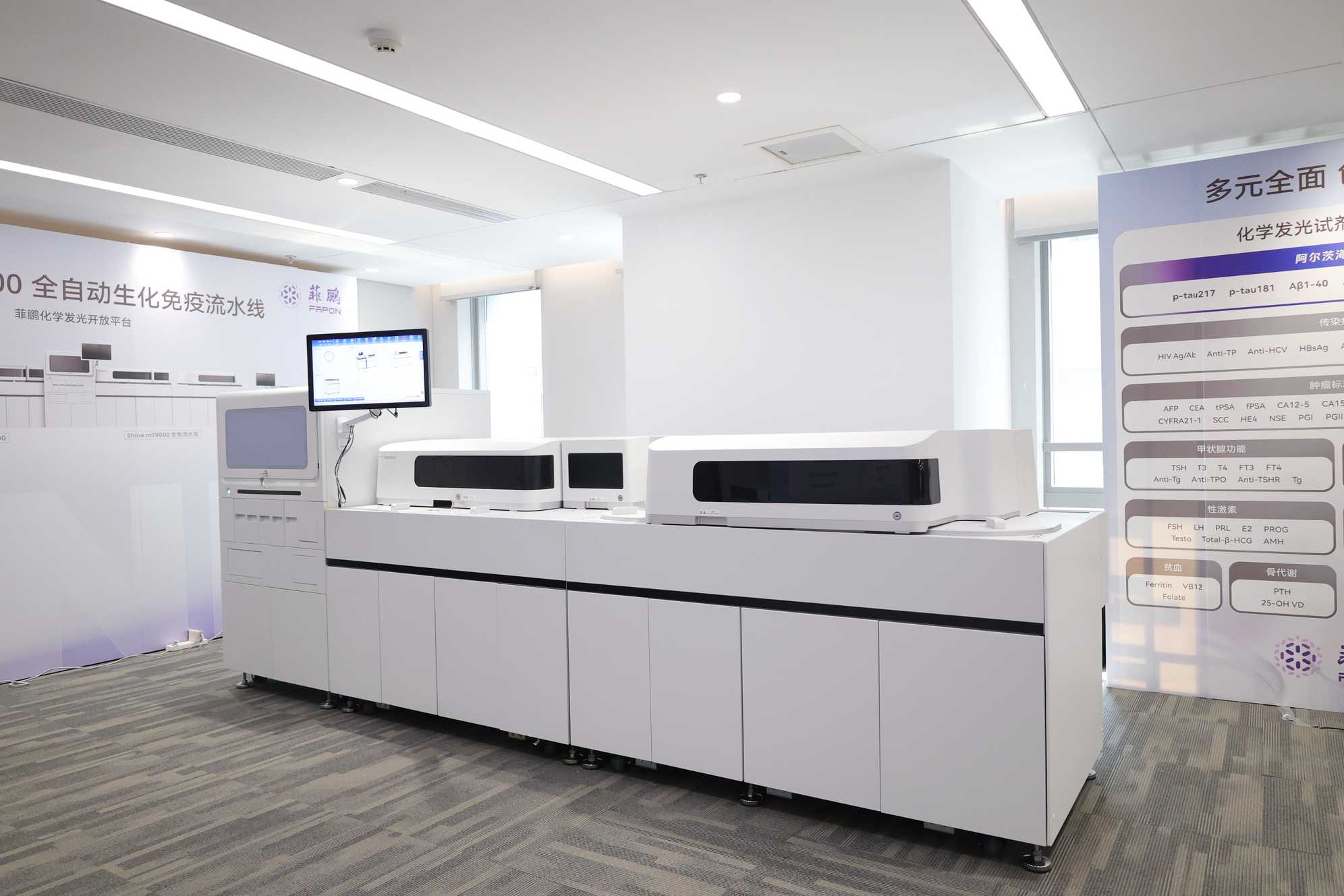 会上,菲鹏重磅推出 Shine mT8000全自动生化免疫流水线。这款为高密度实验室而生的高效生免检测解决方案,以?4.23㎡ 全开放极速生免平台实现“一管血”全流程检测。