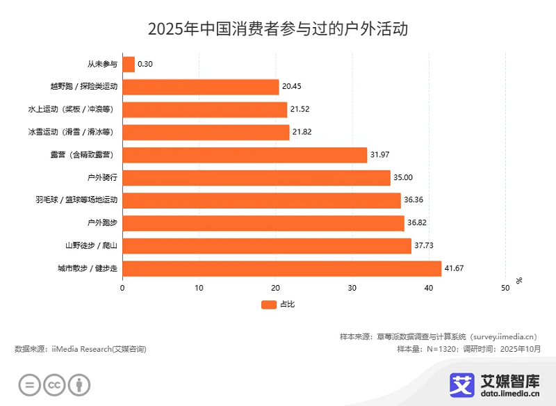 当前,中国户外运动市场正经历从大众普及向专业精深的关键转型。iiMedia Research(艾媒咨询)发布的《中国运动户外市场消费行为调研数据》显示,2025年中国户外消费市场格局日趋多元,超过四成消费者偏好低门槛、高频次的城市健步走,奠定了大众消费的根基。与此同时,以山野步行、户外骑行、户外路跑为代表的“进阶型”深度户外活动,也聚合了超过三分之一的高意愿人群,显示出专业装备与体验服务的巨大市场潜力。