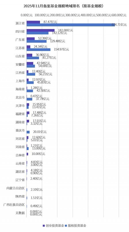 在区域分布上,报告指出11月浙江省以662.18亿元的募资规模以及101支的基金数量领跑全国,产业基础与政策协同效应显著;四川省年末表现突出,在创业投资基金规模高达182.08亿元,位居全国第一,凸显地方国资在推动区域产业发展上的强劲动力。