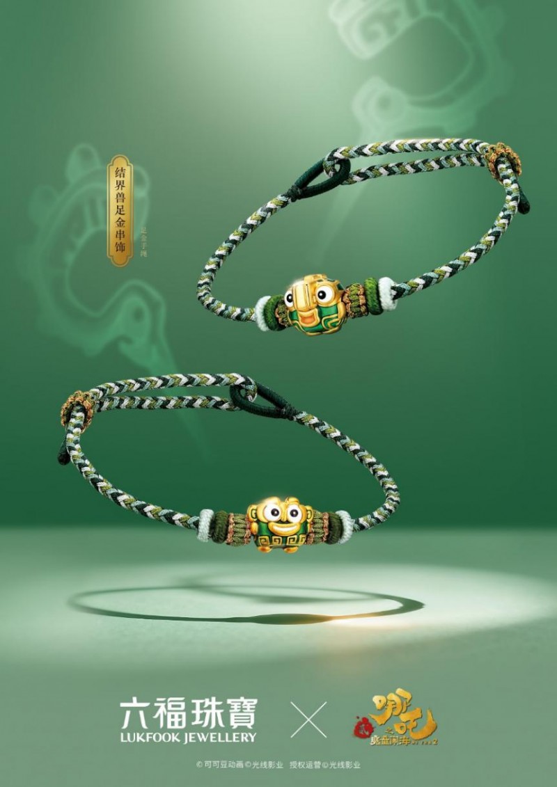 双兽擎珠,结界随形。作为电影《哪吒之魔童闹海》里的“喜剧担当”,萌趣结界兽将无形的守护具象化。以鎏彩点睛一对青铜形象结界兽足金串饰,憨态呆萌的斗嘴形象即刻跃于眼前,并将绿意融入绳纹,宛如结界兽在腕间形影不离,轻声低语,寄以平安顺遂、守护安康的祝愿。