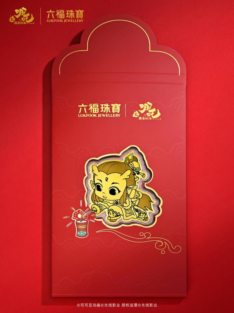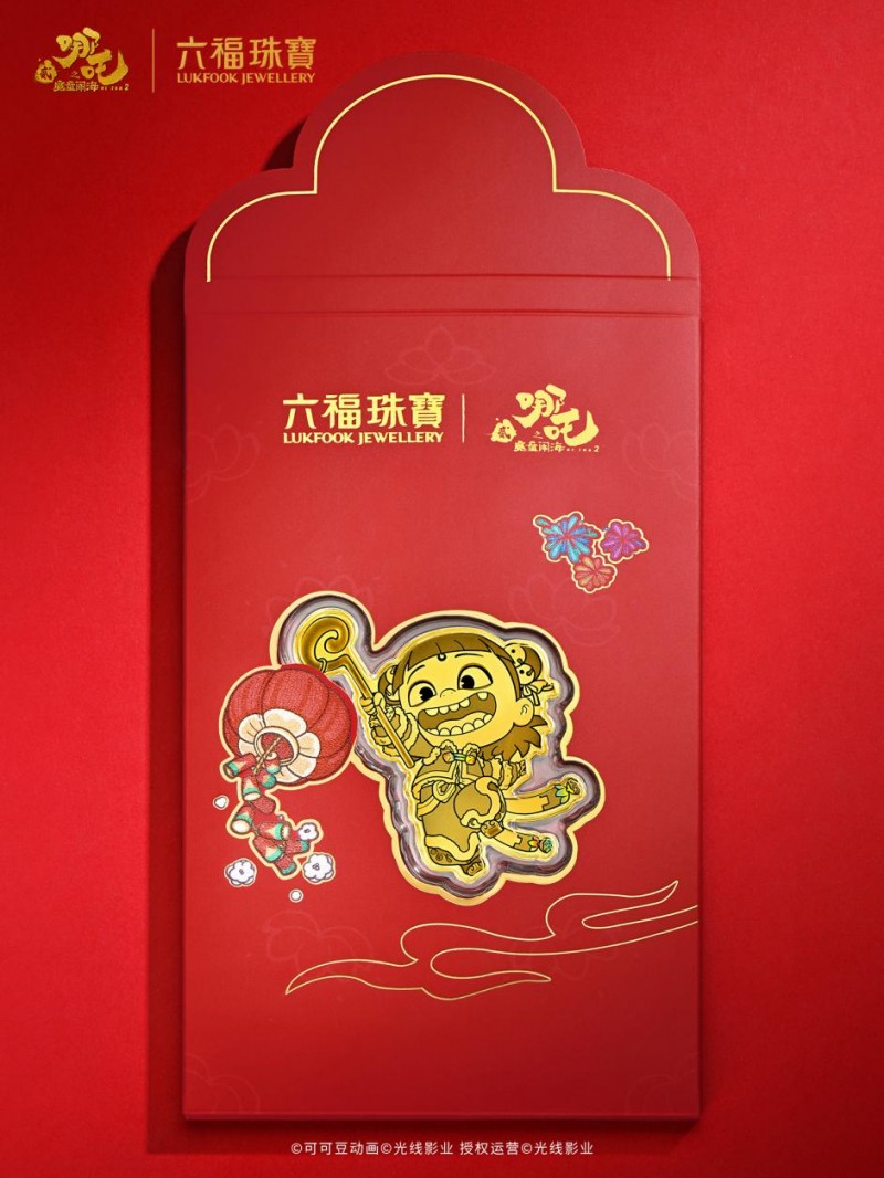 执灯踏福来,好运随身伴。哪吒手执灯笼、欢笑奔跑的鲜活瞬间,步履轻快,灯笼高擎,似在驱散阴霾、照亮前路,尽显少年意气的灵动奔放。将率性洒脱、炽热纯粹的少年英雄,定格于方寸足金之上,匠心雕琢成精致小巧的足金手机贴,以渐变镜面与沙面的分层工艺,搭配微炫彩浮雕的效果,将欢快的动感跃然眼前,丰富的层次让光影熠现活力,绽放璀璨光泽,与“送福上门、好运连连” 的吉祥寓意相映生辉。随赠红包封套的灯笼巧妙连接,以暗纹莲花为底、点缀烟花、鞭炮等喜庆元素,倍添典雅吉祥之感。封套内更附有心意卡,亲手书写的美好祝福,让这枚随身金饰不再是精致的藏品,更是传递情感的温暖载体。