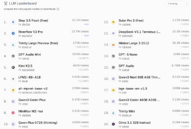 近日消息,阶跃星辰开源 Agent 基座模型 Step 3.5 Flash 上线仅两天成功登顶 OpenRouter 平台 Trending 榜单。该榜单排名来自全球知名大模型聚合平台 OpenRouter 数据,数据基于全球开发者与用户的实际模型调用量,直观反映出模型在真实应用场景中的受欢迎程度与市场接受度。