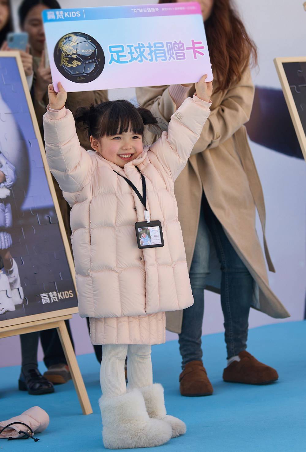 本次活动的核心环节,特邀超级萌娃“一颗肉丸子”担任“一日店长”。一颗肉丸子凭借全网超高人气,成为整场活动的焦点。这位曾亮相上海时装周高梵 KIDS 大秀、完美诠释 “科技保暖与时尚共生” 理念的萌娃,当天以专业又可爱的表现赢得全场喜爱。活动现场,肉丸子与粉丝家庭共同参与 “丸” 转大拼图、“丸” 转贴贴乐等趣味互动,两组游戏的获胜者均获得公益捐赠卡,品牌以高梵 KIDS、肉丸子及获奖者的联合名义,为玉树市第五民族完全小学捐赠了定制黑金梦想足球。在欢声笑语中,公益理念深植每个孩子心中,让爱心传递变得生动而温暖。