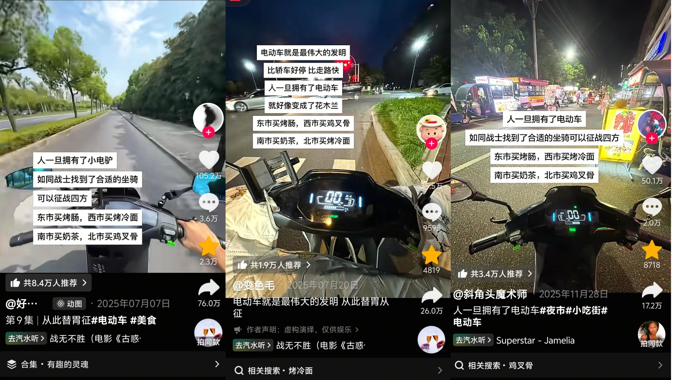 去年下半年以来,新媒体上00后大学生纷纷模仿《木兰诗》风格文案,结合自己的日常生活场景,来表达对电动车的喜爱,引发年轻人的高度共鸣。“东市买奶茶,西市买烤肠,南市取快递,北市接对象……旦辞宿舍去,暮至小吃街,不闻舍友唤,但闻烧烤摊上滋啦声。”甚至,结合自己的本地化特色,大家还改编出了地域化版本,比如武汉网友的“东湖买藕汤,光谷买手摇”;上海版的“旦辞复旦楼,暮归安福路,不闻地铁末班车,但闻葱油拌面咕嘟。”