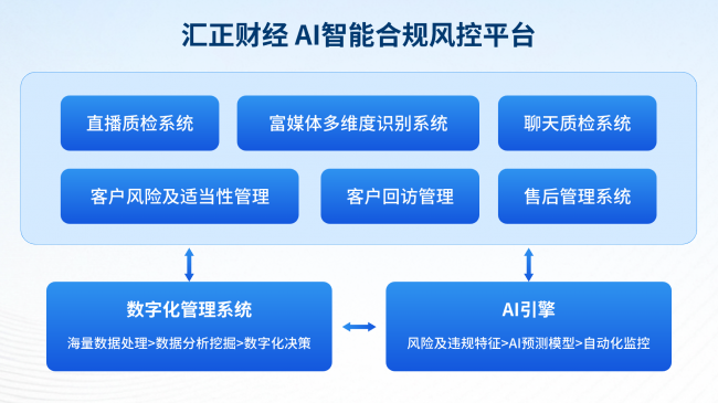 面对证券投顾行业“营销渠道多元化、业务场景复杂化、客户数据密集化”的新挑战,传统人工合规审查已难以满足“实时性、全面性、精准性”要求。对此,汇正财经打造了一套汇正智能合规风控平台,通过整合语音识别、自然语言处理、图像识别及大数据分析等先进技术,覆盖营销质检、直播事中质检、素材质检、客户风险及适当性管理、客户回访管理、客诉管理、合规数字化管理以及审票系统等多个核心业务场景。