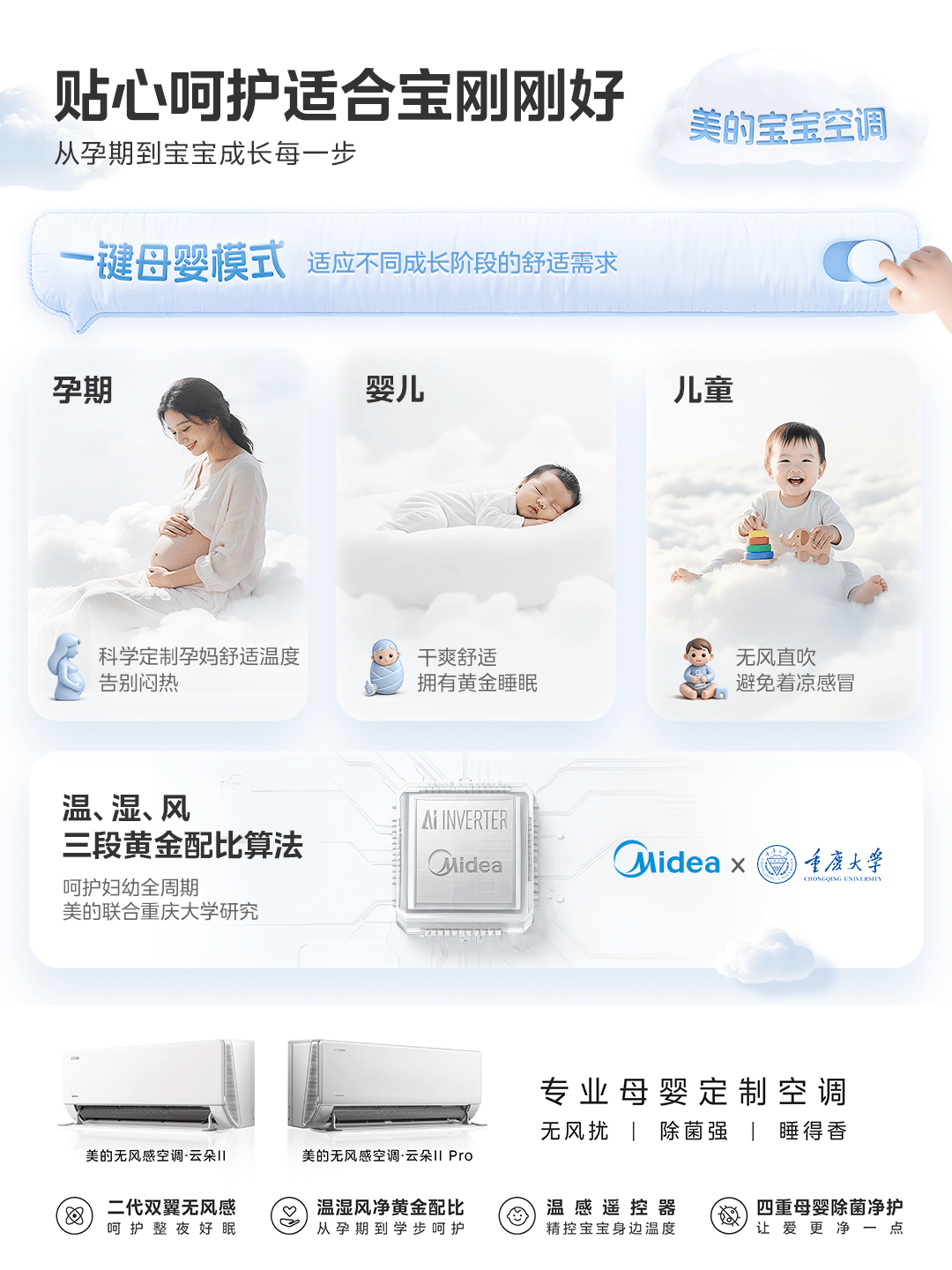 更精准的呵护源于对成长阶段的深刻理解。依托美的空调与重庆大学联合研究的“母婴热舒适模型”,云朵二代可一键切换“孕期、0-3岁、3岁以”上三大不同模式,像精心调配配方奶粉一样,为每个阶段智能配比温度、湿度与风速,提供“刚刚好”的空气。