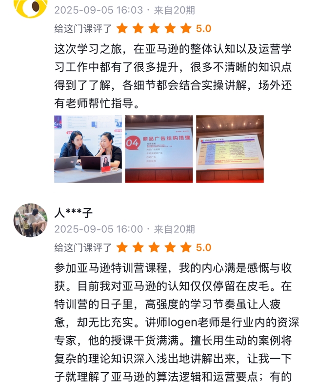 “既有战略层面的趋势分析,又有能直接落地的实操工具,解决了我们公司在选品和广告投放上的老大难问题。”“之前对亚马逊财务结算规则一知半解,这次课程彻底理清了逻辑,对后续制定考核标准很有帮助。”